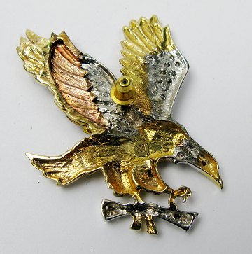 Broche af 14 kt. flerfarvet guld i form af ørn, dekoreret med facetsleben rubinfarvet sten samt talrige, diamantslebne sten. L. ca. 58 mm. stemplet ARR og 14 K. Vægt ca. 17,5 gr.