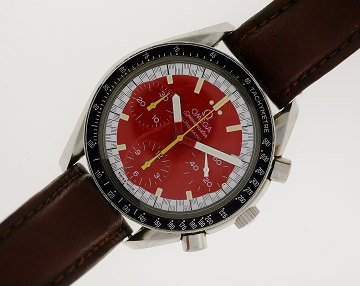 Herrearmbåndsur fra Omega, model Speedmaster Automatic, limiteret udgave Michael Schumacher, i kasse af stål, rød skive m. stregindeks, tachymeterlynette, chronograffunktioner, monteret m. læderrem, plexiglas, automatisk urværk. Ø. 36.