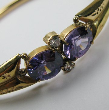 Oval armlænke af guld, stemplet 70 % (Portugal?) prydet med 2 ovale, facetslebne ametyster, flankeret af 2 diamantslebne sten. Vægt 9,9 gr. Diam. 48 x 56 mm.