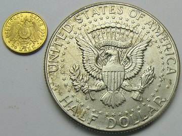 Amerikansk Kennedy-halfdollar i sølv samt tysk miniaturmedaille, formentlig af guld, præget som preussisk 20 mark.
