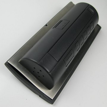 Georg Jensen rejsevækkeur i kasse af børstet stål med fod af gummi som samtidig fungerer som beskyttelseshylster under rejsen. L. 16 cm.