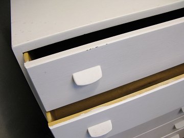 Hvidbemalet kommode af teak- og bøgetræ med 6 éns skuffer med skråstillede håndtag. 80 x 42 x 110 cm.