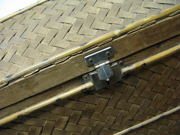 Orientalsk rejsekiste af træ og pap med bambusflet, handtag og snaplukke samt hængsler af delvis forkromet metal. Ca. 70 x 42 x 50 cm.