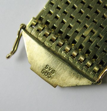 Bred armlænke af 14 kt. guld i murstensmønter, L. ca. 17.5 cm.