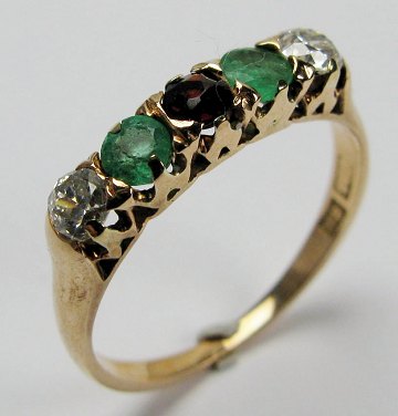 Multicolor ring af 14 kt. guld, prydet med 2 diamanter, tilsammen ca. 0,25 ct. samt 2 facetslebne smaragder, Diam. ca. 3,5 mm. og granat, Diam. ca. 3 mm. Ring Str. 54, fremstillet hos Bernhard Hertz i 1960'erne.