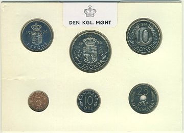 Møntsættet indeholder samtlige mønter i Danmarks møntserie: 10- 5- og 1-kr samt 25-, 10- og 5 øre.