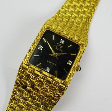 Oleg Cassini smykkeur i kasse og med lænke af gulddoublé. Sort, rektangulær skive, prydet med diamanter, stregindikationer og central sekundviser. Quartzværk.