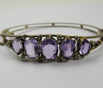 Armring af gulddoublé, prydet med 5 facetslebne ametyster i forløb samt små perler. Ca. 45 x 65 cm.
