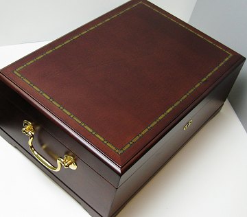 Humidor, luksus opbevaringboks til gode cigarer. Lakeret boks i mahogny look med messingbeslag, lås og nøgle. Indbendig med justerbare inddelingsfag. Humidifier og hygrometer medfølger. Ca. 39 x 28 x 16 cm.