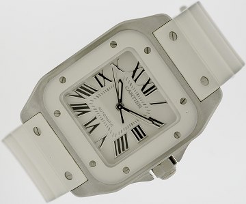 Damearmbåndsur fra Cartier, model Santos 100 MM, ref.nr.: 2878, i kasse af stål, hvid skive m. sølvfarvede romertal, monteret m. hvid gummirem, stålspænde m. logo, safirglas, automatisk urværk. Ø. 32,5 x 33 mm.