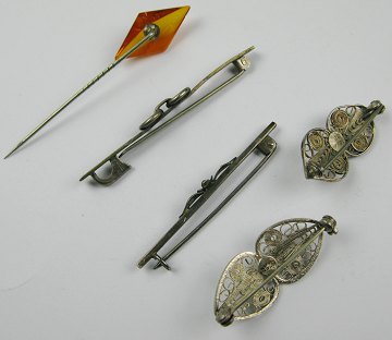 5 smykker af sølv, bestående af 2 filigranbrocher af sterling sølv, 2 nåle samt nål med sleben ravstykke.