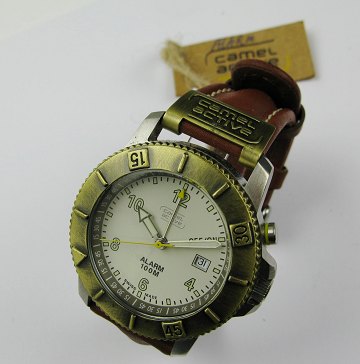 Camel Active Alarm herrearmbåndsur i kasse af stål. Hvid skive med arabertal og stregindikationer, central sekundviser og datovisning i #3 positionen, alarmviser. Quartsværk. Urkasse Diam. ca. 42 mm. Læderrem med metalspænde.