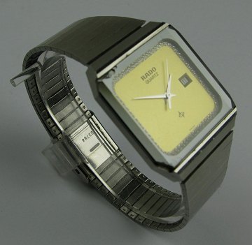 RADO damarmbåndsur í rektangulær kasse af stål med guldfarvet skive, omkranset af talrige små look alike brillanter (sten). Ingen stregindikationer, central sekundviser, datovisning i #3 positionen. Lænke af stål med flip-lock spænde. Urkasse ca. 30 x 34 cm.