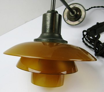Poul Henningsen (1894-1967), PH nedadlysende væglampe med metalfatningshus og patinerede metaldele, monteret med 2/2 ravfarvede skærme. Produceret hos Louis Poulsen fra 1931.