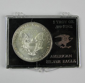 Displayæske med påtryk "American Silver Eagle" og 1 troy ounce .999 medfølger.