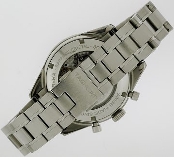 Herrearmbåndsur fra Tag Heuer, model Carrera, ref.nr.: CV2014, calibre 16, i kasse og m. lænke af stål, sort skive m. stregindeks, tachymetre-lynette, chronograffunktion, datoangivelse ved 3" position, safirglas, automatisk urværk. Ø. 41 mm.