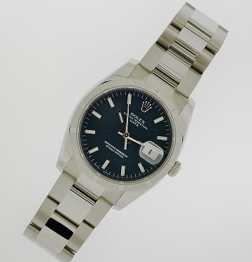 Herrearmbåndsur fra Rolex, model Oyster Perpetual Date, M-serie, ref.nr.: 115210, i kasse og m. oysterlænke af stål, midnatsblå skive m. stregindeks, dataangivelse ved 3" position, riflet lynette, safirglas, automatisk urværk. Ø. 34 mm.