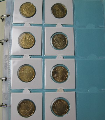Album temamønter 10 kr og 20 kr, heriblandt skibsmønter og tårnmønter fordelt på 20 stk. 20 kr. og 8 stk. 10 kr.