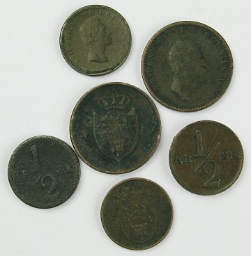 Lot Frederik VI skillingsmønter bestående af skilling 1813, 4 skilling 1815, 3 skilling 1812, 2 skilling 1815, 2 stk. ½ skilling 1838, heraf en med utydelig dato.