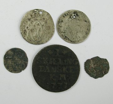 Lot skillingsmønter, bestående af: Christian V, skilling 168?, Frederik IV, 8 skilling 1700, Frederik V, skilling 1763, DWI 12 skilling 1740 samt Christian VII, skilling 1771.