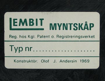 Lembit møntskab med 8 møntskuffer, heraf 5 skuffer til mønter med en max. Diam. 28 mm., 2 skuffer til mønter på max. 30 mm. samt 1 skuffe til mønter med max. 45 mm. i Diam.