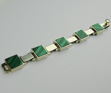 Flot og massiv armlænke af sterling sølv med 5 led prydet med nefrit hvorimellem 5 mindre led. L. ca. 18,5 cm. Samlet vægt ca. 85 gr. Fremstilled hos guldsmed Sven Haugaard, Kolding efter 1962.