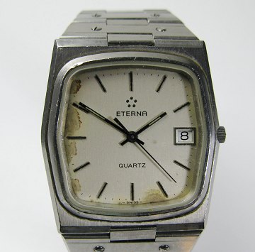 Eterna Quarts midsize armbåndsur i rektangulær kasse af stål med metalfarvet skive, stregindikationer, central sekundviser og datovisning i #3 positionen.