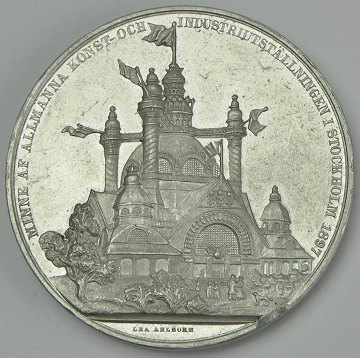 Svensk medaille af aluminium, præget i anledning af Den Almindelige Kunst- og Industriudstilling i Stockholm i 1897. På fs. ses portræt af kong Oscar II i profil og på bs. ses de bygninger hvor udstillingen fandt sted. Ø. 45,2 mm.