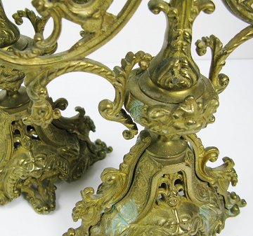 Par antikke, trearmede kandelabre af bronze, rigt dekoreret med ornamentik, maskaroner og fabeldyr. H. ca. 34,5 cm. Formodentlig Frankrig omkring 1870.