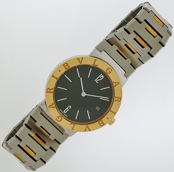 Herrearmbåndsur fra Bvlgari, ref.nr.: BB33SGD, i kasse og m. lænke af 18 kt. guld og stål, sort skive m. delvis stregindeks og arabertal, datoangivelse ved 3" position, safirglas, quartz urværk. Ø. 33 mm.