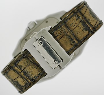 Herrearmbåndsur fra Cartier, model Santos 100, ref.nr.: 2656, i kasse af stål m. sølvgrå skive m. romertal, krone m. facetteret sort safir, monteret m. original lys krokodillepræget læderrem m. stålspænde, safirglas, automatisk urværk. Ø. 38,5 mm.