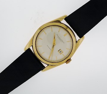 Vintage herrearmbåndsur fra International Watch Co.(IWC), calibre 8321, i kasse af 18 kt. guld, lys pie-pan skive m. stregindeks, datoangivelse ved 3" position, monteret m. ældre læderrem fra "Sørensen, Kopenhagen", forgyldt stål-spænde, plexiglas, manuelt optræk/automatisk urværk. Ø. 34,5 mm.