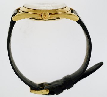 Vintage herrearmbåndsur fra International Watch Co.(IWC), calibre 8321, i kasse af 18 kt. guld, lys pie-pan skive m. stregindeks, datoangivelse ved 3" position, monteret m. ældre læderrem fra "Sørensen, Kopenhagen", forgyldt stål-spænde, plexiglas, manuelt optræk/automatisk urværk. Ø. 34,5 mm.