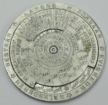 Landsudstillingen Aarhus 1909, erindringsmedaille af aluminium med evighedskalender på bagsiden. Diam. ca. 38 mm.