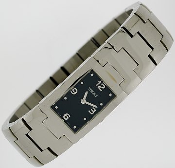 Damearmbåndsur fra Versace, i kasse og m. lænke af stål, sort skive m. henholdsvis arabertal og punktindeks, safirglas, quartz urværk. Ø. 20 x 27 mm.