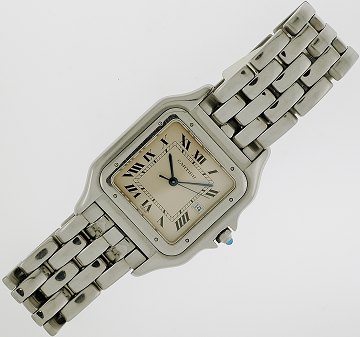 Herrearmbåndsur fra Cartier, model Panthére, ref.nr.: W25032P5, i kasse og m. lænke af stål, lys skive m. romertal, datoangivelse ved 3" position, optrækskrone prydet m. carbochonsleben safir, safirglas, quartz urværk. Ø. 29,5 x 40 mm.