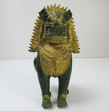 Thailandsk Singh tempelløve af patineret bronze, rigt dekoreret med ornamentik. H. ca. 20 cm. Thailand, 20. århundrede.