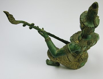 Thailandsk figur af patineret bronze i form af Sueng spiller, rigt dekoreret med ornamentik. H. ca. 18 cm. Thailand, 20. århundrede.
