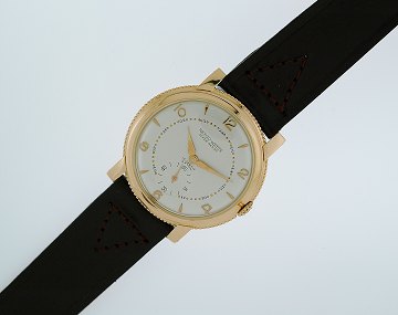 Usædvanlig veludført herrearmbåndsur fra Repco Watch, model Super-Resist, i kasse af 18 kt. rødguld, sølvfarvet skive m. arabertal, separat sekundviser, optrækskrone prydet m. stiliseret blomst, monteret m. ny læderrem i irsk læder samt forgyldt spænde, manuelt optræk. Ø. 35 mm.