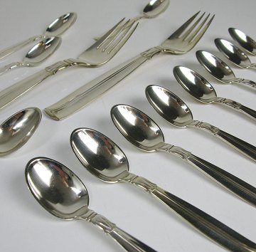 14 dele Karina bestik af sølb bestående af 2 middagsgafler samt 12 théskeer. Samlet vægt: 278 gr.