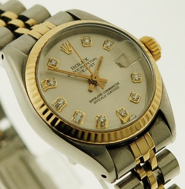 Rolex Oyster Perpetual damearmbåndsur, model Datejust med ref.nr.6901 i kasse og med jubileelænke af 18 kt. guld og stål, metalfarvet brillantbesat skive med punktindeks, datoangivelse ved 3" position, automatisk værk. Urkasse Diam. 26 mm.