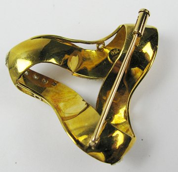 Broche i form af sløjfe af 18 kt. guld, prydet med 15 brillanter, tilsammen ca. 0,15 ct.
