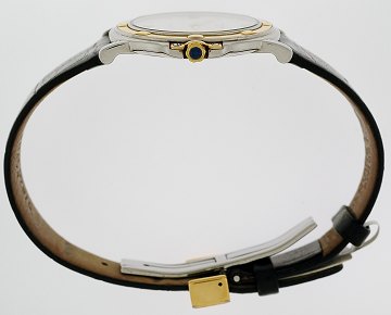 Herrearmbåndsur fra Raymond Weil, model Parsifal, ref.nr.: 9189, i kasse af 14 kt. guld og stål, cremefarvet skive m. romertal ved 3, 9 og 12, datoangivelse ved 6" position, optrækskrone i guld prydet m. carbochonsleben safir, monteret m. original sort læderrem m. foldespænde, safirglas, quartz urværk. Ø. 34 mm.