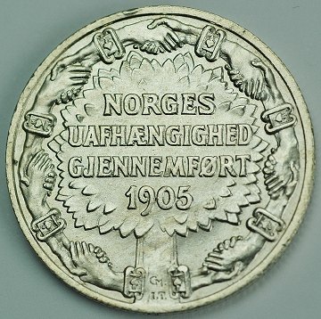Norsk 2 kr, præget i anledning af Norges uafhængighed 1905.