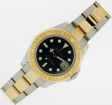 Midsizearmbåndsur fra Rolex, model Yachtmaster, ref.nr.: 168623, K-serie, i kasse og m. oysterlænke af 18 kt. guld og stål, justerbar guldlynette, blå skive m. punktindeks, datoangivelse ved 3" position, safirglas, automatisk urværk. Fra 2001. Ø. 34 mm.