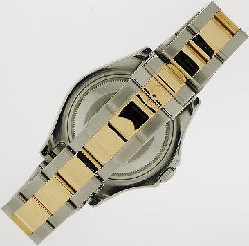 Midsizearmbåndsur fra Rolex, model Yachtmaster, ref.nr.: 168623, K-serie, i kasse og m. oysterlænke af 18 kt. guld og stål, justerbar guldlynette, blå skive m. punktindeks, datoangivelse ved 3" position, safirglas, automatisk urværk. Fra 2001. Ø. 34 mm.