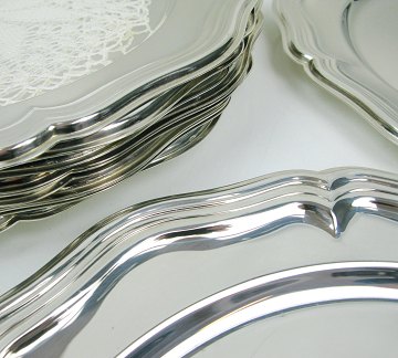12 dækketallerkener af sølvplet med buet svejfet og riflet kant. Diam. 28 cm. Fremstillet hos Kronen Danmark.
