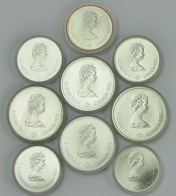 Ni stk. canadiske 5 og 10 dollars af sterlingsølv, præget i anledning af OL i Montréal 1976.