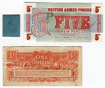British Armed Forces, 8 sedler 50, 5 og 1 pund samt 5 og 19 new pence og 1 shilling. Derudover medfølger 2 Pfennig Stadt Pasing nødpenge.