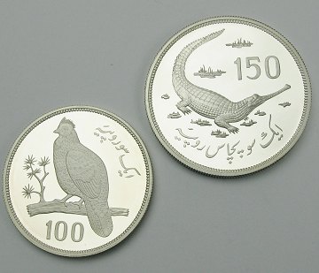 Pakistan, 100 og 150 rupees møntsæt sterling sølv, henholdsvis KM 40 og KM 42.